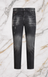 Jeans uomo Carrot Fit in denim nero slavato, caratterizzati da dettagli paint-splash e leggere abrasioni per un look urbano e moderno.