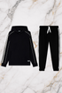 Il completo è caratterizzato da bande logate EA7 lungo le maniche e i pantaloni, dettaglio iconico che valorizza il look urban e contemporaneo.